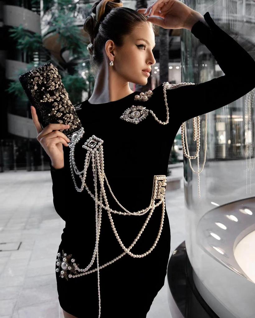 Experience elegance with this stunning beaded sleeve slim bodycon mini dress, crafted entirely from soft, high-quality cotton for a comfortable and flattering fit. The luxurious beaded sleeves add a touch of sophisticated charm, making it perfect for any special occasion or night out. The slim silhouette beautifully accentuates your curves, while the mini length adds a playful, contemporary edge. Make a statement in a dress that effortlessly combines style and comfort.