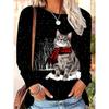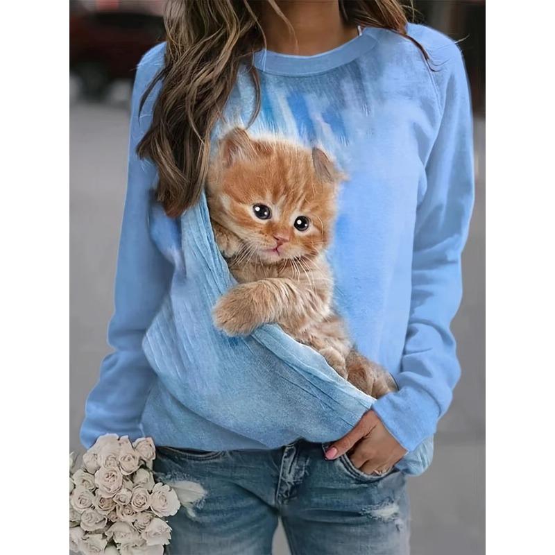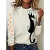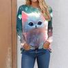 Round Neck 3D Cat Printed Top Casual Long Sleeved Women's T-shirts - Soft Medium Stretch Polyester Fabric Spring and Autumn Relaxed Fit Clothing