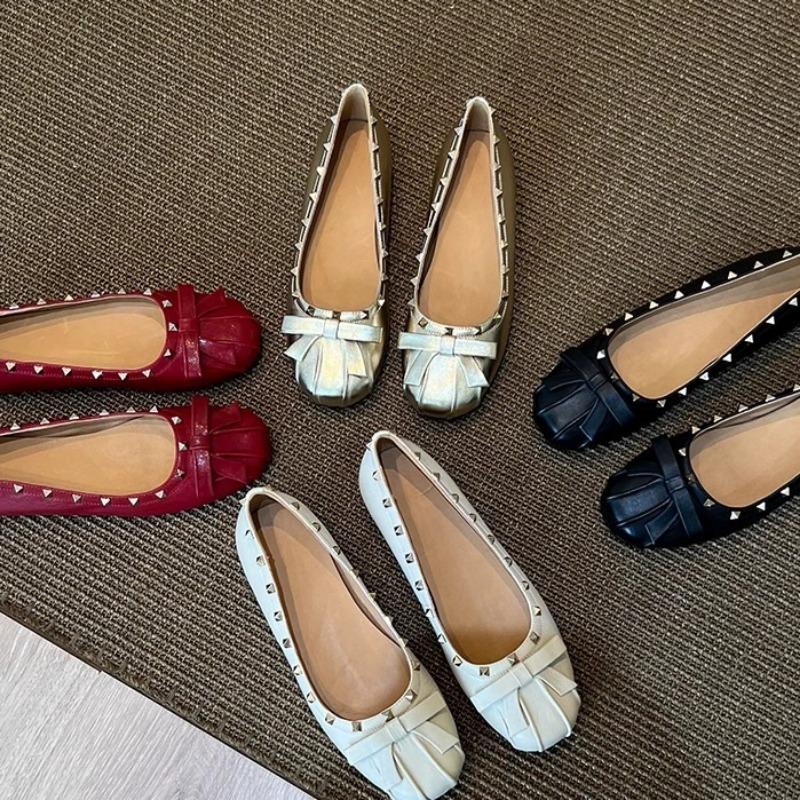 Woman Bowcropped Studded Ballet Slippers French Rivet Style Mary Jane Shoes For Summer Flats Women's Dancewear Loafers Mules