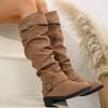 Western Style Pleated Flat Bottom Booties Women's Autumn Winter Thick Heel Long Boots Leather Belt Buckle Cotton Lined Ankle Boo