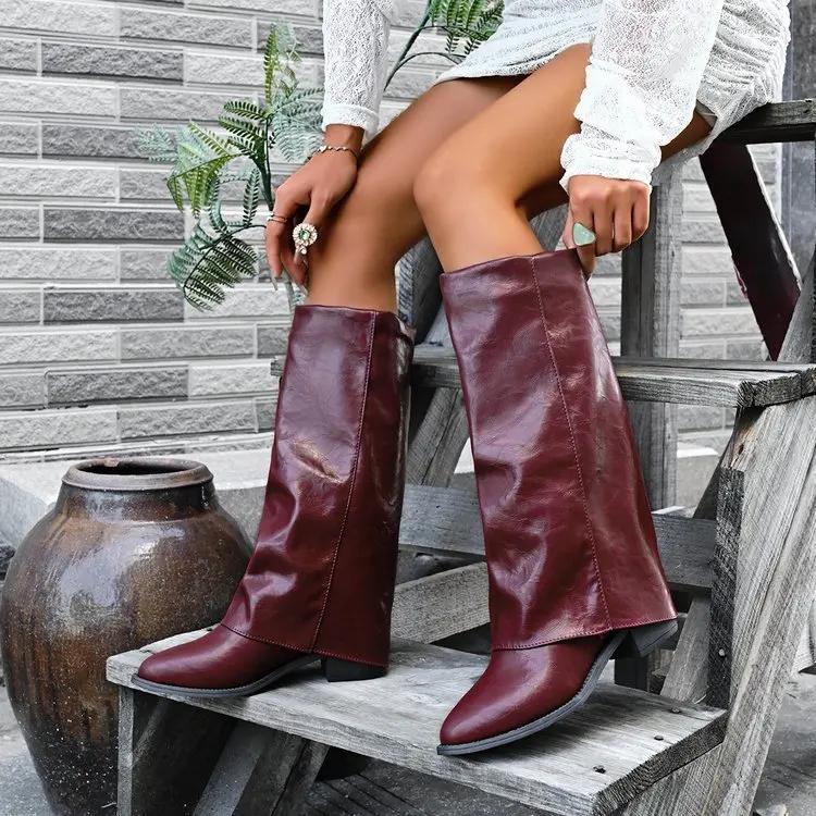 Fashion Vintage Denim Wandering Boots Women 2025 Autumn Pointed Toe Medium Heel Slip On Knee Boots Sexy Designer Women's Shoes