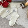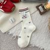 White Cute Cartoon English Dog Boneless Mid-calf Socks for Women, Pure Cotton Bow Polka Dot Pile Socks