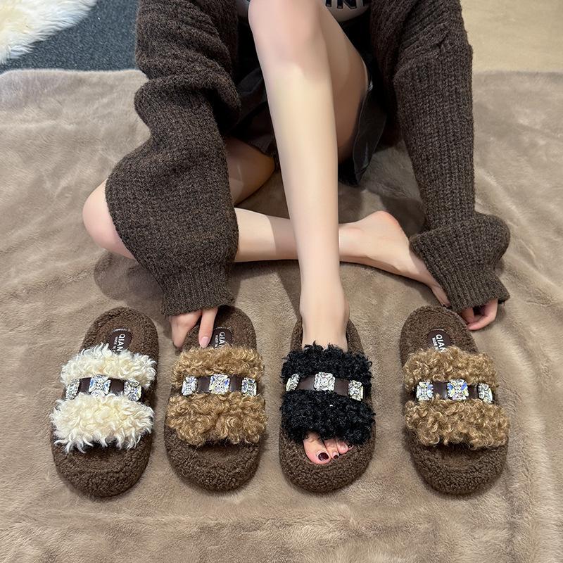 Thick-soled Plush Design Fluffy Shoes for Women's Outer Wear 2025 Autumn and Winter New Home Non-slip One-word Rhinestone Cotton Slippers