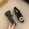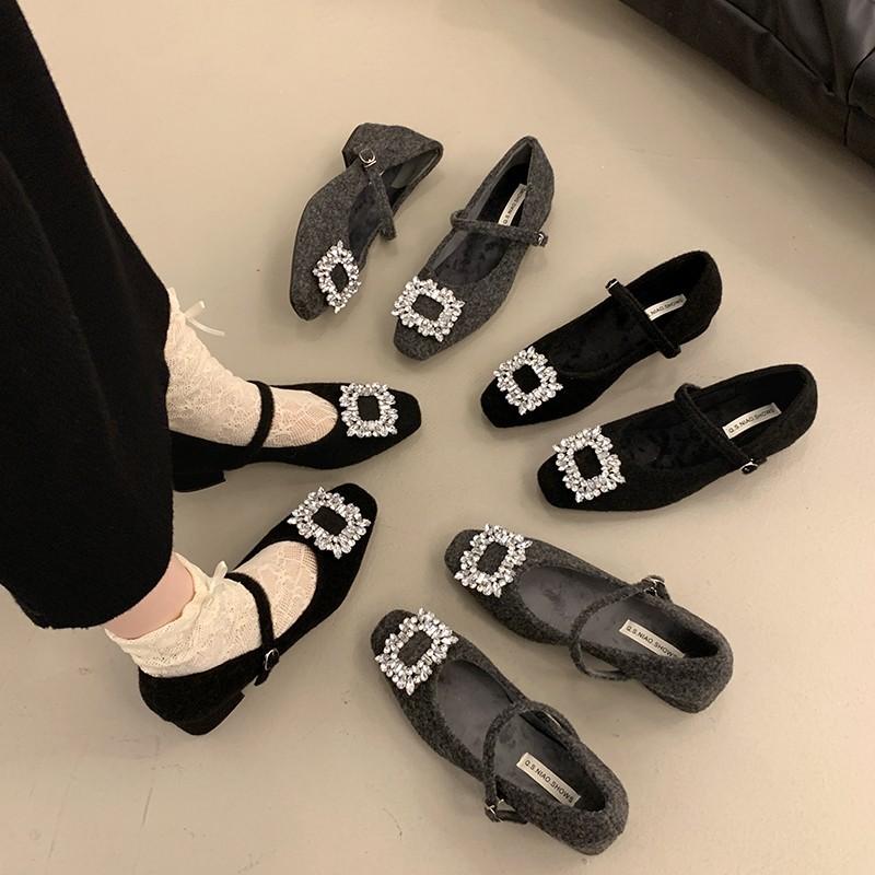 French Temperament Square Head Rhinestone Light Luxury One-word Belt Velvet Mary Jane Shoes Women's Woolen Wool Shoes Women's Winter Wear Single Shoes