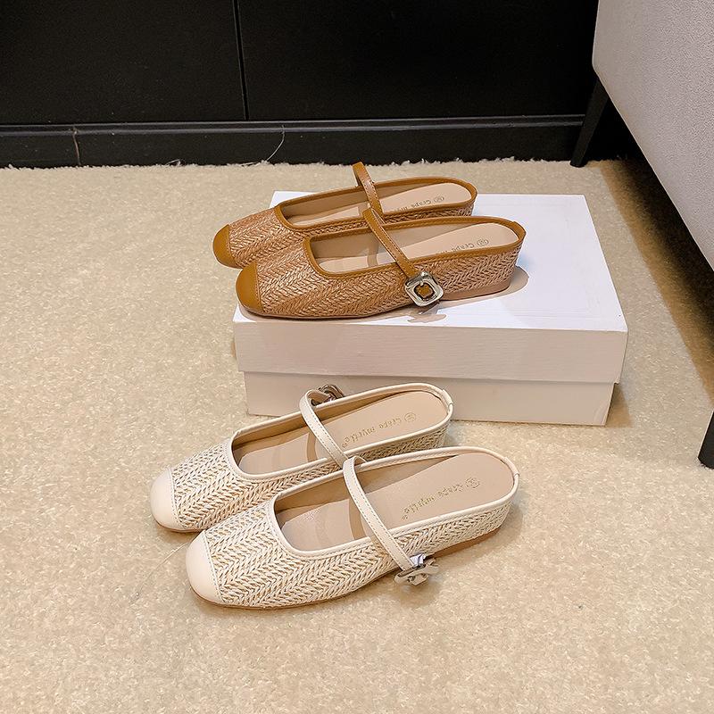 Grape Mother of the Same Style, Holiday Style Straw Woven Square Head Cool Slippers Lazy Half Drag Women Inner Height 2025 Summer New