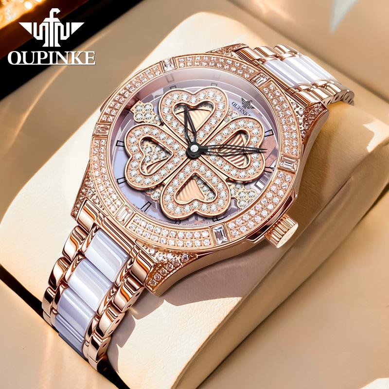 OUPINKE Women's Watch Four-leaf Clover Rotating Dial Automatic Mechanical Watch for Ladies and Women