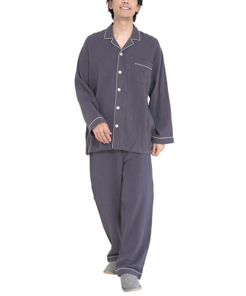 ON NISHIKI Long Sleeve Top and Bottom Double Long Loungewear Size Men's Pajamas, 100% Cotton, Front-Opening, Set, Spring/Autumn, Gauze, Skin-Friendly,
