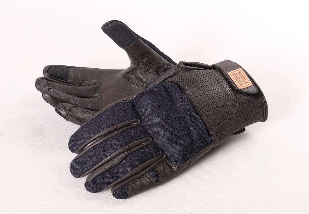 Degner TG-54 Leather Denim Combination Gloves with Built-in Knuckle Guard and Smartphone Compatible, Navy (Navy/Brown), S Size, Navy