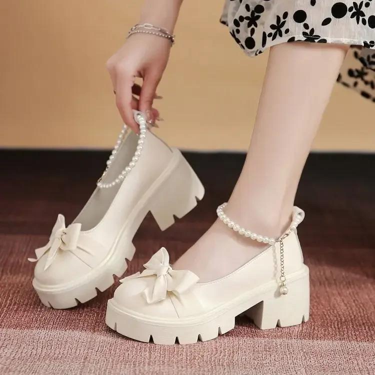 2024 Autumn New Mary Jane Small Leather Shoes for Women British Style Thick Soled Round Head Bow Women's Shoes