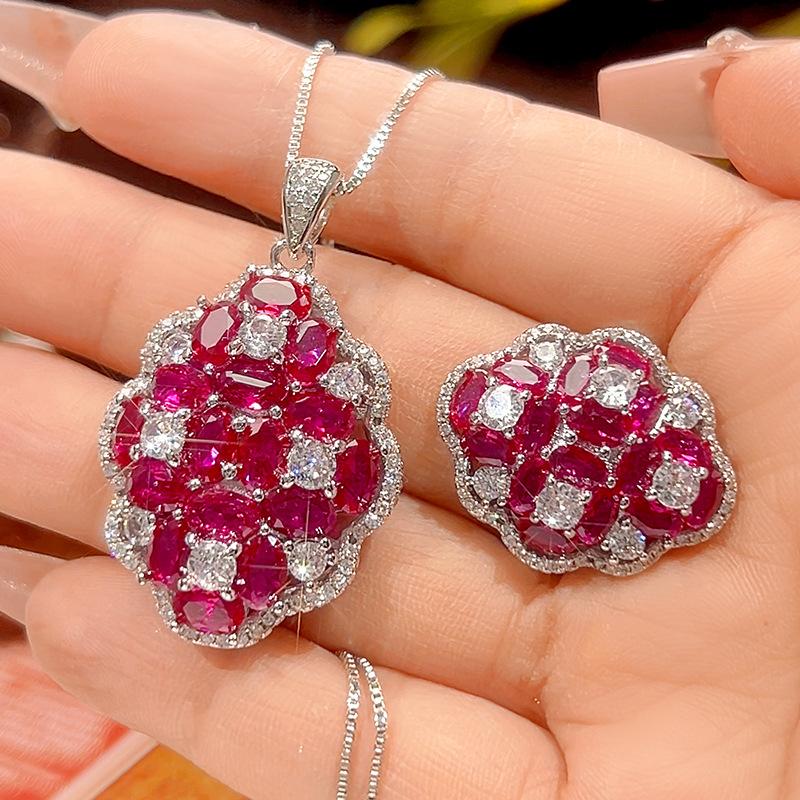 Popular Jewelry Copper Bottom Gold-Plated Simulation Red Corundum Micro-Inlaid Light Luxury Jewelry Set Women