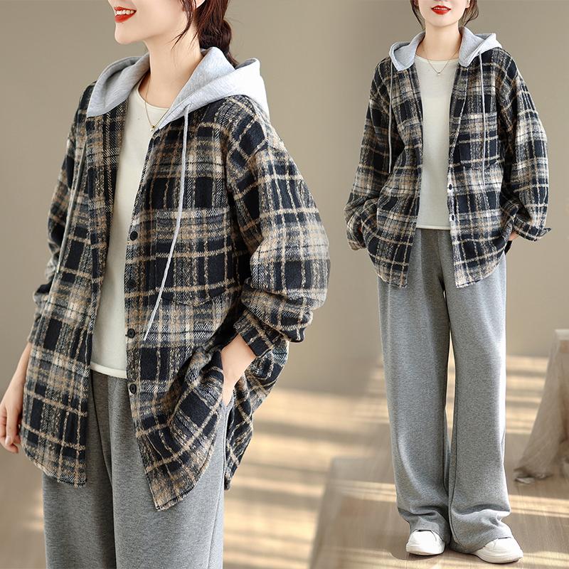 DIMANAF 2025 New Autumn Winter Plus Size Women Coats Jackets Hooded Cotton Thick Long Sleeve Loose Casual Outerwear Vintage Lady Plaid