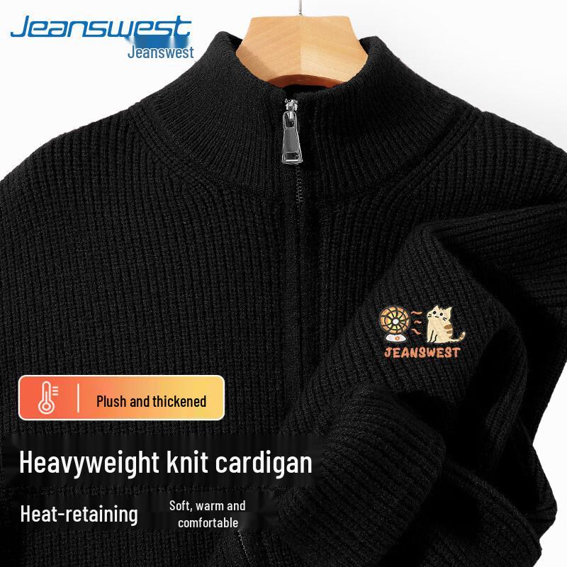 Jeanswest Men's Heavyweight Cat Print Stand Collar Zip Knit Cardigan