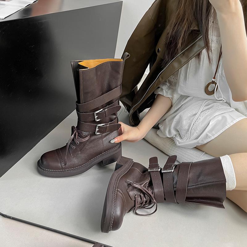 Stay stylish and comfortable this season with our retro British mid-calf lace-up boots. These women's boots feature a classic Western style, enhanced by a thick sole that subtly increases height. Crafted with a microfiber upper, they offer durability and a modern appearance. The rubber sole ensures a solid grip, providing stability with every step. Designed specifically for women, the boots include a polyurethane insole for added comfort and a cozy cotton lining to keep feet warm during colder months. Iconic lace-up and belt buckle details add a touch of vintage charm, making these boots a perfect addition to any autumn or winter wardrobe.