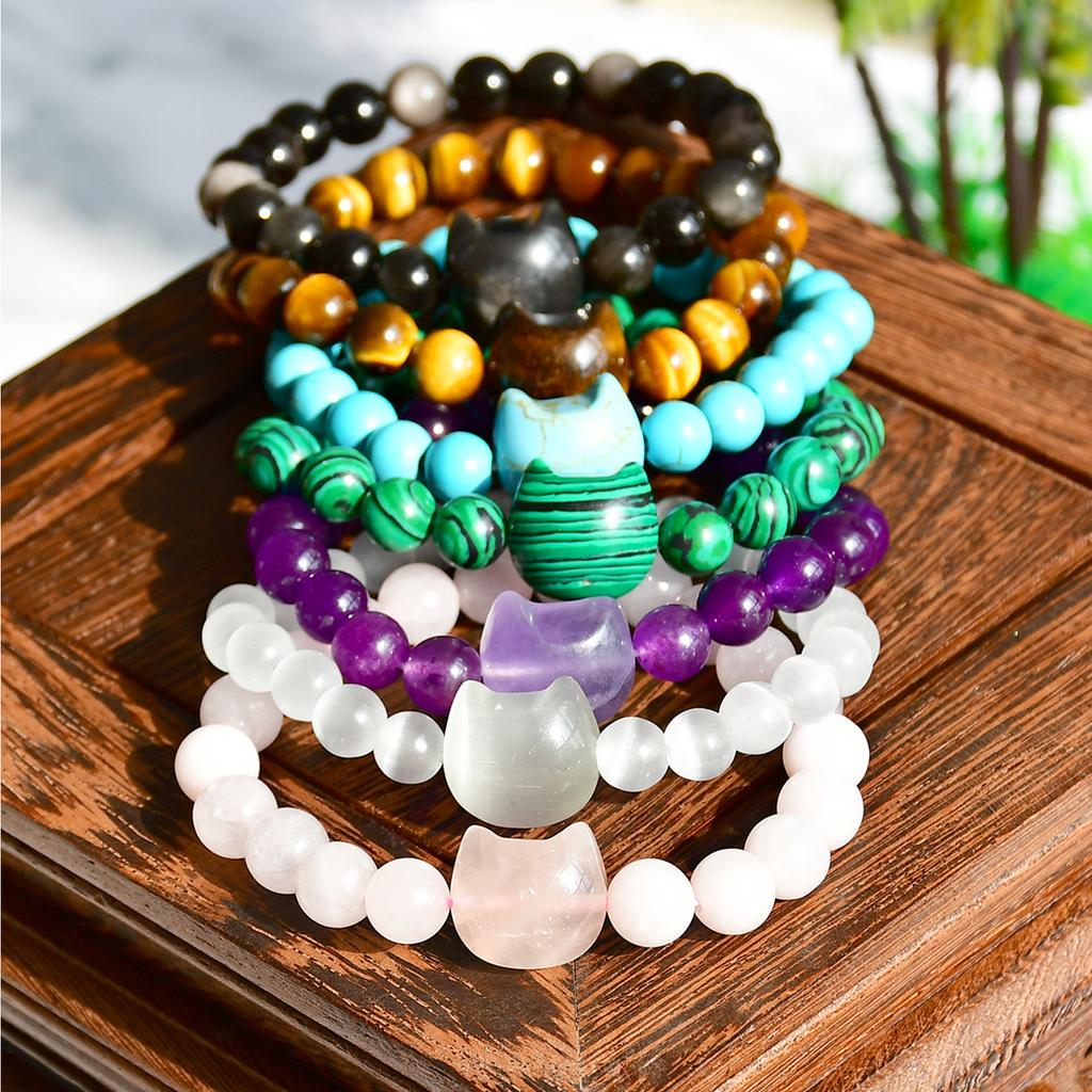 Bohemian Natural Stone Bead Bracelet Cats Head Charm Wristband Handmade Jewelry Gift for Birthdays and Anniversaries