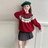 Girls' Fair Isle Red Knitted Sweater - Round Neck, Long Sleeve, Chunky Knit, for Autumn/Winter 2025, Mid & Big Kids Casual Jumper.