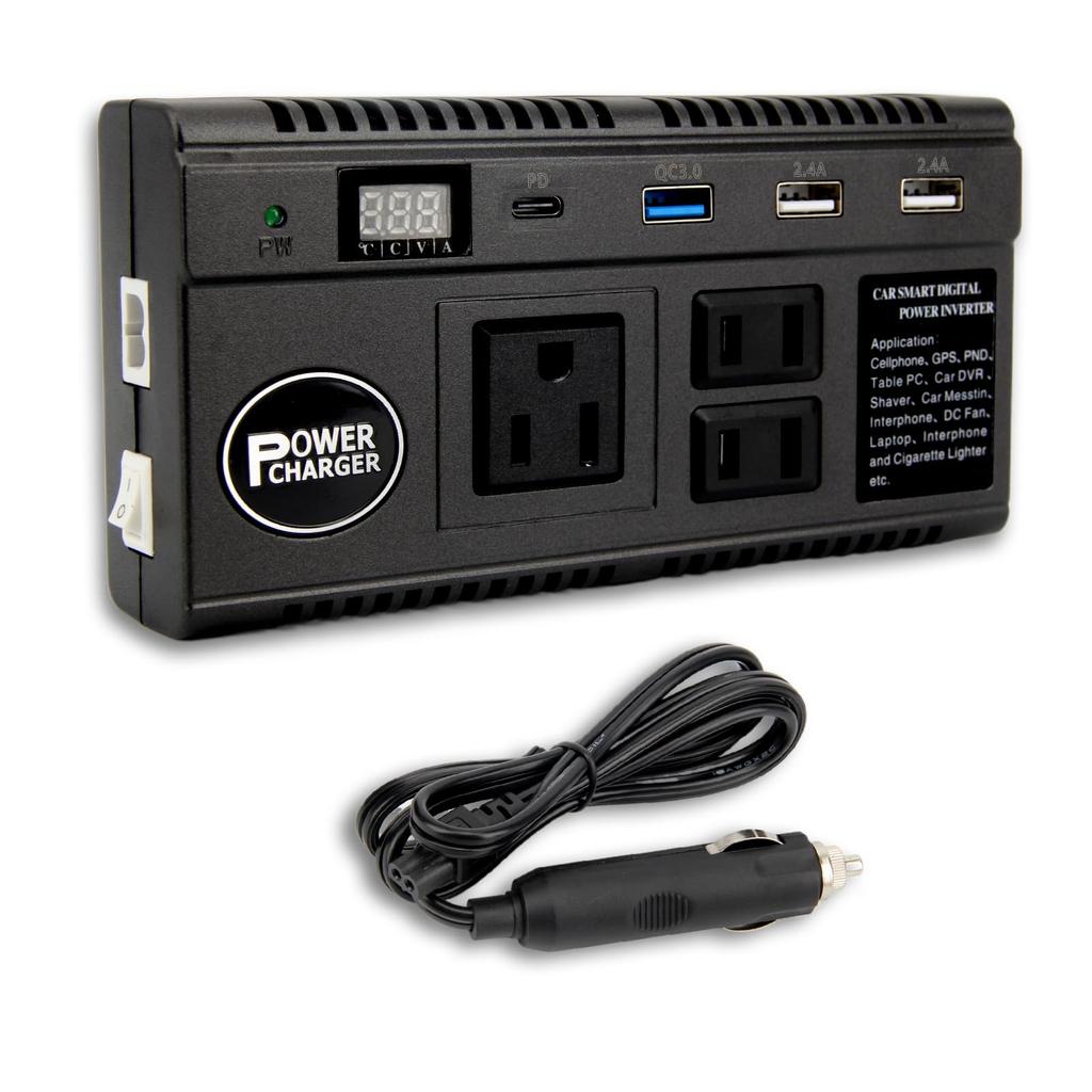 New model PD port added! This car inverter converts DC 12 V / 24 V power to AC 110 V and be used with both 120 W power supply, DC 12 V / 24 V. Compatible with car/24V trucks. 9 Power Supply Ports: 3 USB power outlets, 1 3 AC outlets, 2 cigarette lighter sockets, 1 PD port You simultaneously charge your smartphone, tablet, e-reader, laptop, etc. so you enjoy driving without worrying about running out of for your precious electronics. It is equipped with an ON/OFF switch, so it be used for energy saving. You also turn off the power while it is inserted into a cigarette socket. It also comes with a power indicator light that turns on when it is on, making it easy to understand. Note: This product is corrected sine wave, so it cannot be used with precision instruments such as TVs, printers, etc. In addition, when connected to the cigarette lighter socket of a 12 V car, it may cause unstable operation of appliances over 100 V. Use with household appliances under 100 V (computers, cell phones, cameras, handsets, lasers, small fans, etc.)