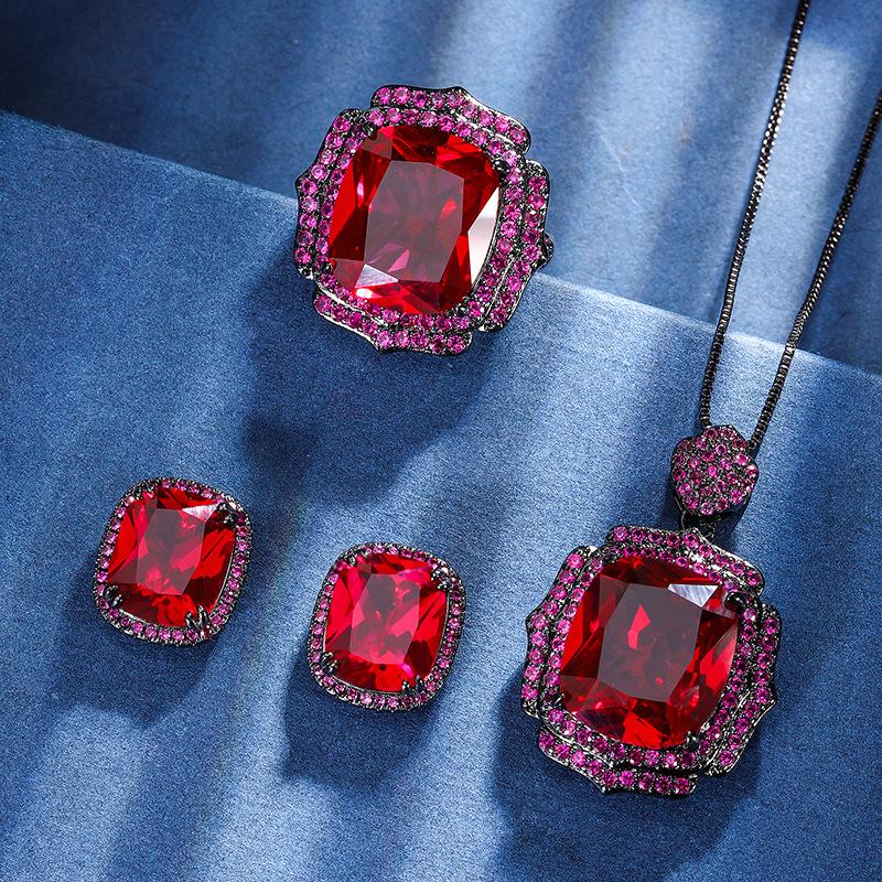 Jewelry Copper Bottom Gold-Plated Simulation Red Corundum Fat Rectangular Black Gold Personalized Set 14 * 16