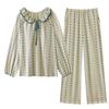 This pajama set is crafted from a blend of Lycra and cotton, ensuring both comfort and flexibility. Designed with long sleeves and full-length pants, it's perfect for the transitional seasons of spring and autumn. The set provides a cozy fit for relaxing at home while being stylish enough to wear outdoors. The lacquer cotton material gives it a soft, luxurious feel, making it a versatile addition to your wardrobe.
