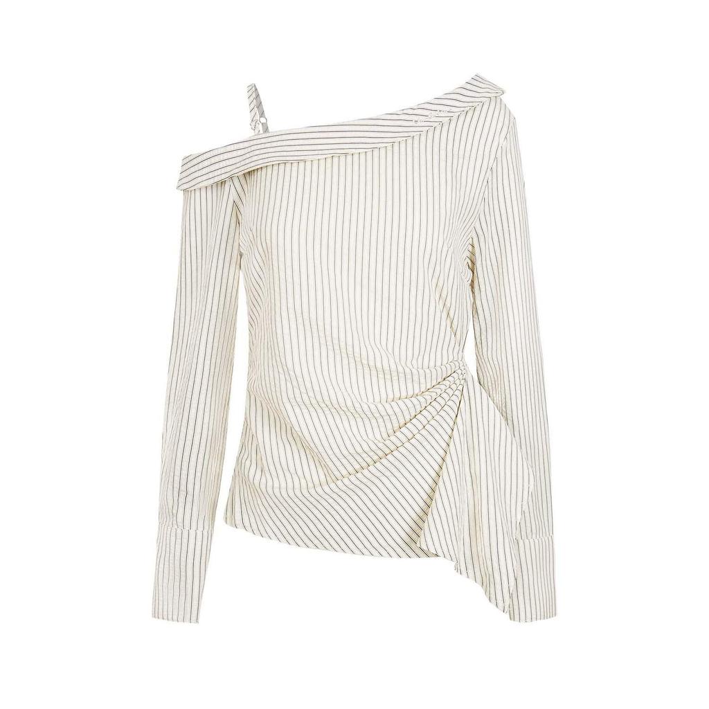 UNBDNS Women's One-Shoulder Striped Tie-Up Shirt: Slimming, Versatile Long Sleeve Top for Autumn