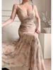 Elegant European and American Style Chiffon Dress - Sexy Deep V Backless, Long Versatile Printed Suspender Dress for Women