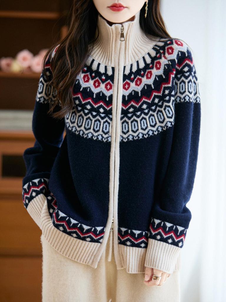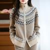 Embrace cozy elegance this autumn and winter with the Women's Thickened Fair Isle Pure Wool Cardigan. This loose knit sweater coat is crafted from high-quality wool, ensuring warmth and comfort during chilly days. Featuring a tailor neckline and long sleeves, it presents a timeless Fair Isle pattern that adds a touch of classic charm to any outfit. Perfect for layering, this cardigan promises both style and functionality, making it an essential addition to your cold-weather wardrobe.