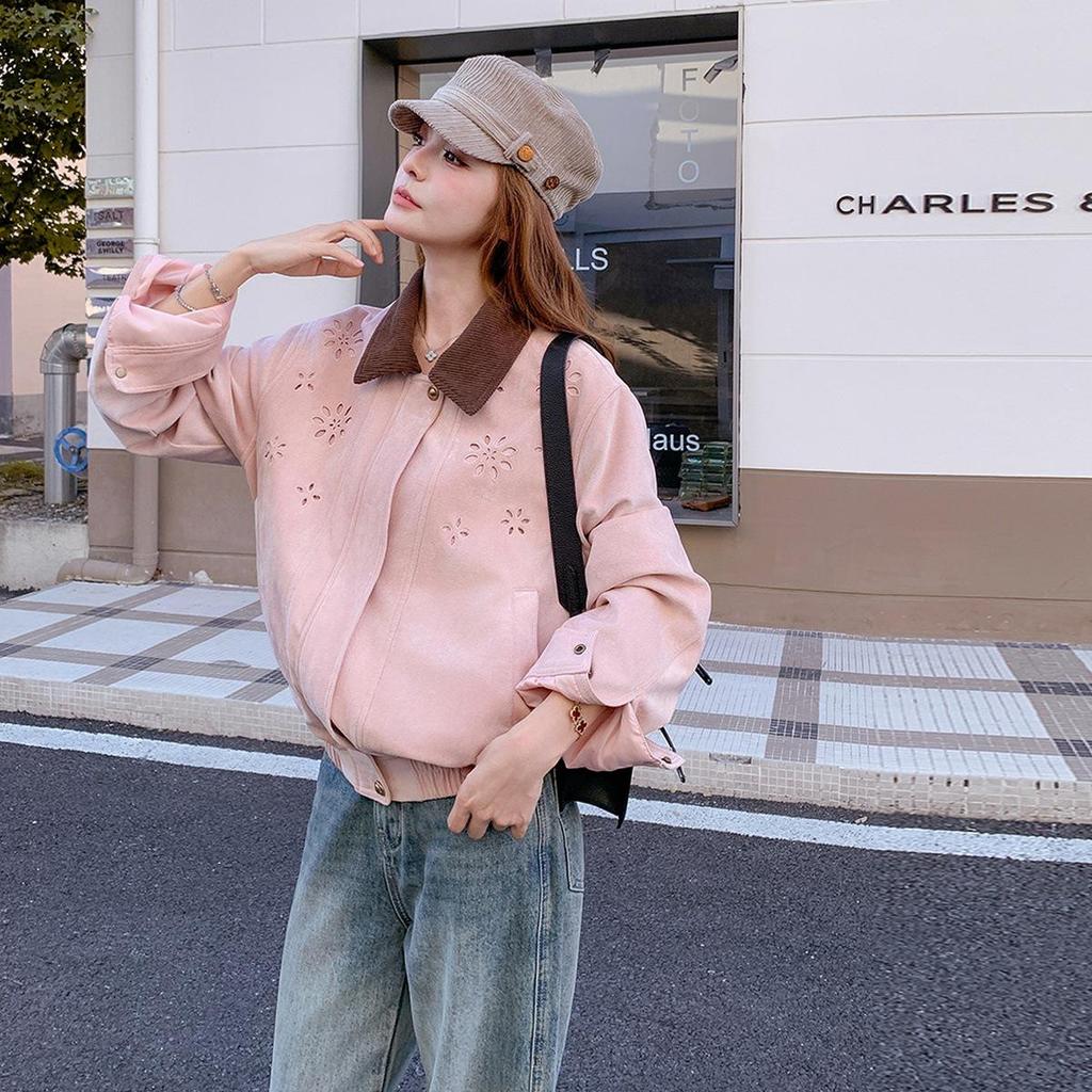 Embrace the autumn season with this fashion-forward pink suede short jacket, designed specifically for women seeking a chic and age-defying look. The jacket features a unique hollow design and a petite fit, ensuring you stand out in style during the cooler months. Crafted with medium outerwear thickness and long sleeves, it provides just the right amount of warmth and comfort. The sophisticated turn-down collar adds an elegant touch, making this jacket a versatile and stylish addition to any wardrobe. Ideal for those who appreciate Korean-inspired fashion with a modern twist.
