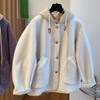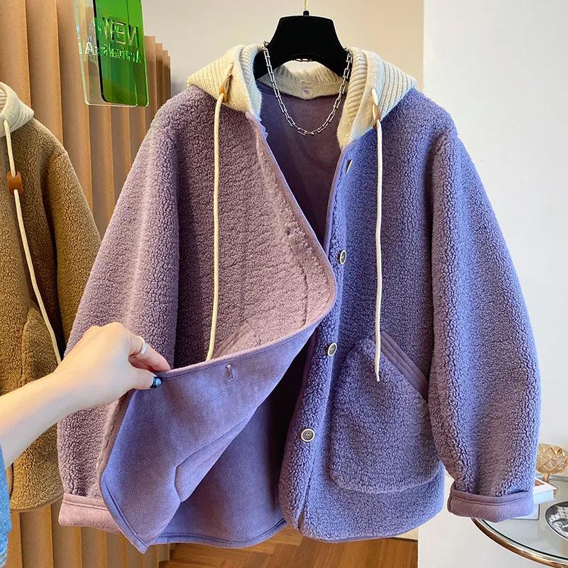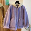 Women's 2025 Patchwork Lamb Wool Hooded Sweatshirt – Fleece-Lined and Loose Fit for Autumn/Winter