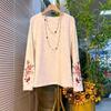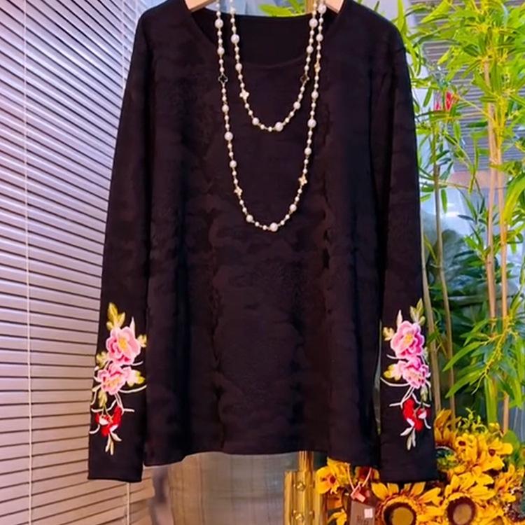 Discover elegance and comfort with this plus size women's shirt, featuring a round neckline and long sleeves. Crafted from a flexible spandex material, it offers a flattering, slimming fit. The solid pattern is tastefully accentuated by beautifully embroidered floral cuffs, adding a touch of retro charm to your wardrobe. Perfect for both casual and semi-formal occasions, this shirt is a versatile addition to any fashion-forward collection.