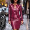 European and American Women's PU Leather Sling Bodycon Skirt with Long Sleeve Round Neck Cardigan Two-Piece Set