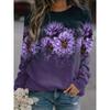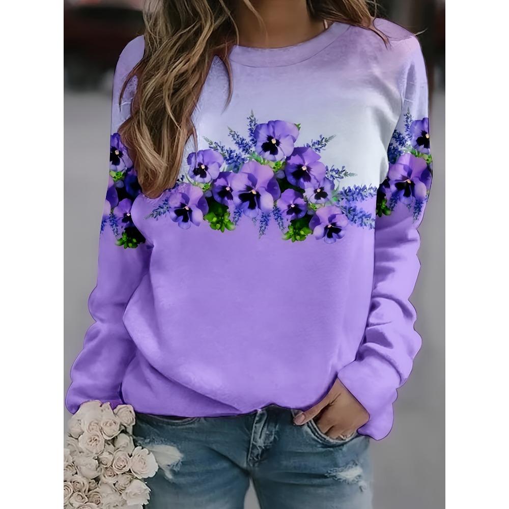 Women's Sports Shirt with Purple Flower Pattern Print, Women's Casual Long Sleeved Round Neck Pullover, Women's Clothing