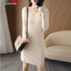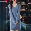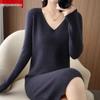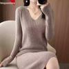 Hengyuanxiang Women's V-Neck Cashmere Sweater Dress - Mid-Length, Long Sleeve, Knitted