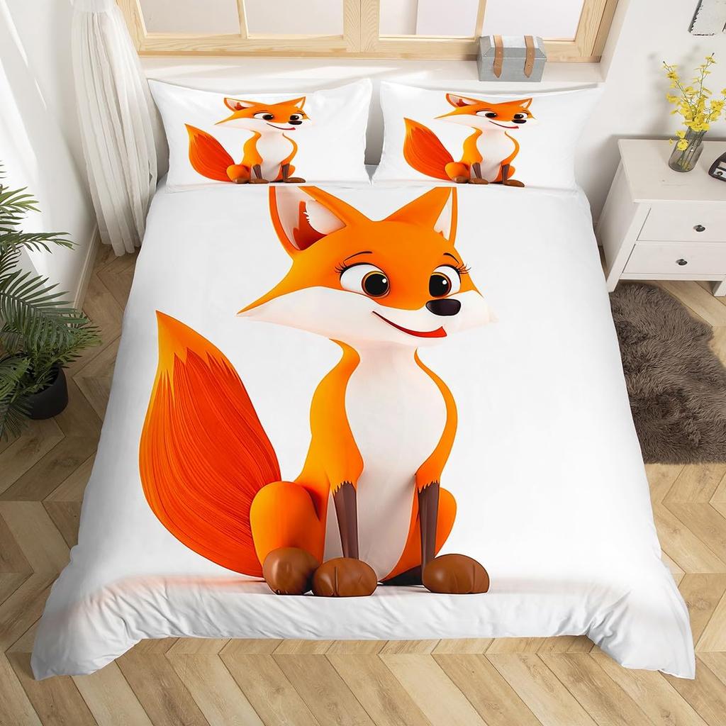 Kids Cartoon Fox Duvet Cover King Queen Orange Animal Bedding Set Girls Teens Bedroom Decor Comforter Cover with 2 Pillow Case