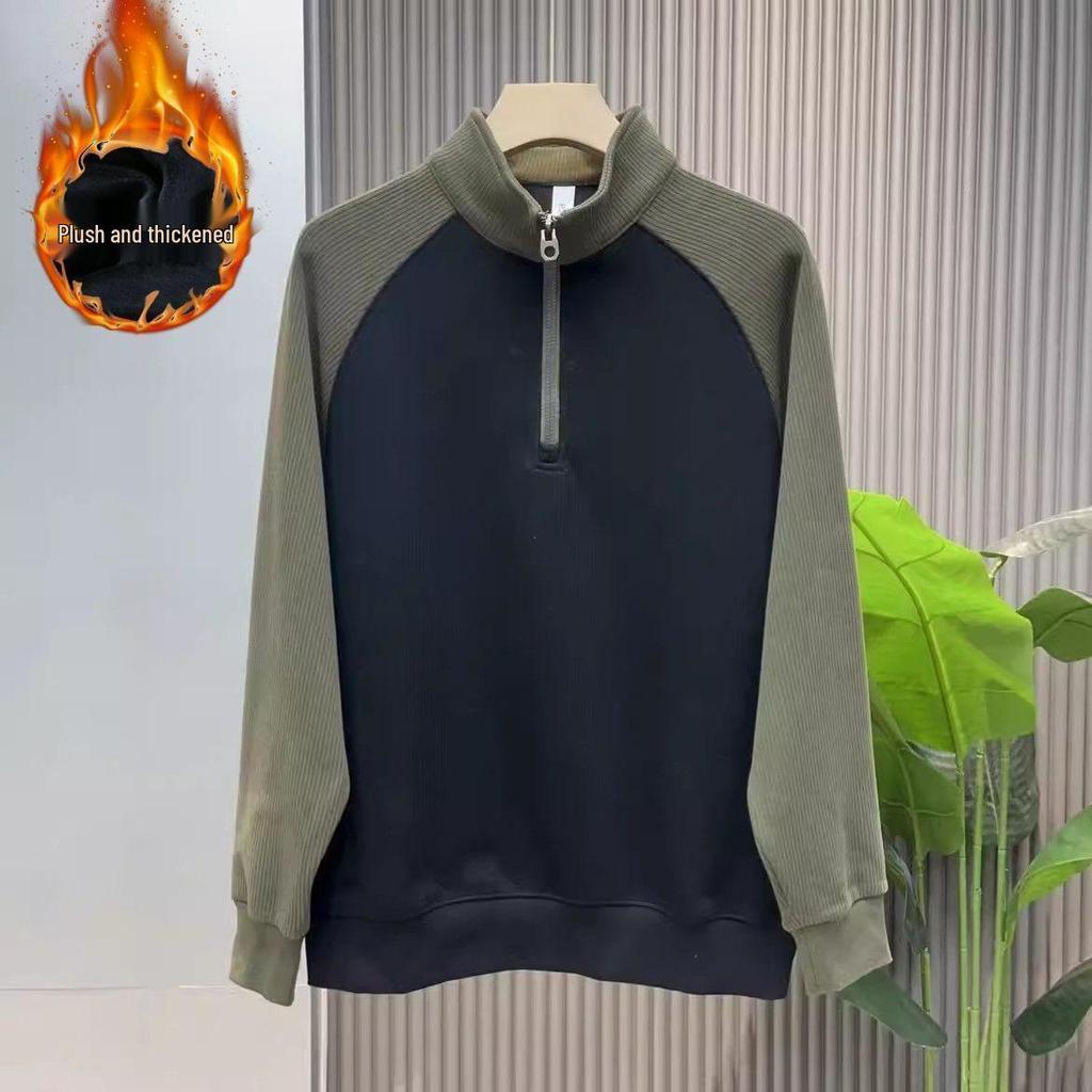 Winter 2025 Men's Color Block Fleece-Lined Stand-Up Collar Sweatshirt: Trendy Casual Half-Zip Outerwear