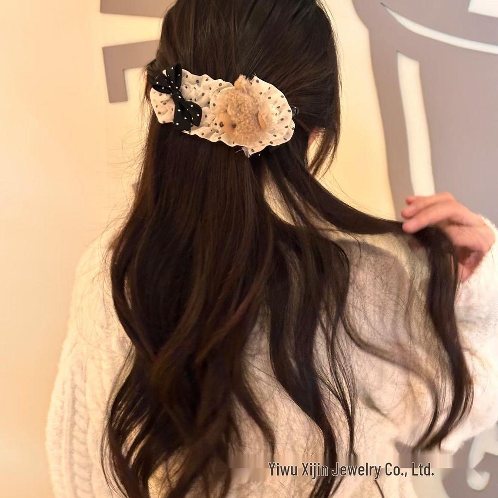 Polka Dot Banana Clip Teddy Bear with High Ponytail - Cute Autumn/Winter Academy Style