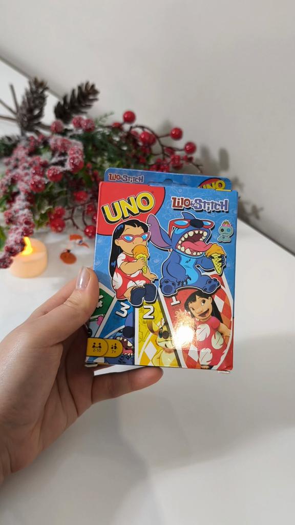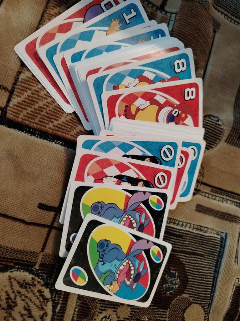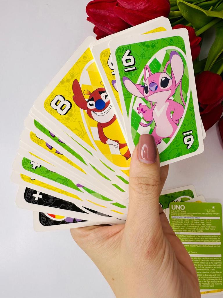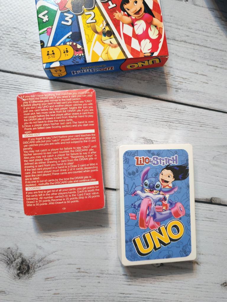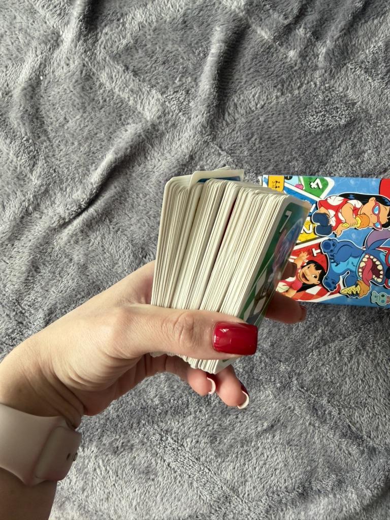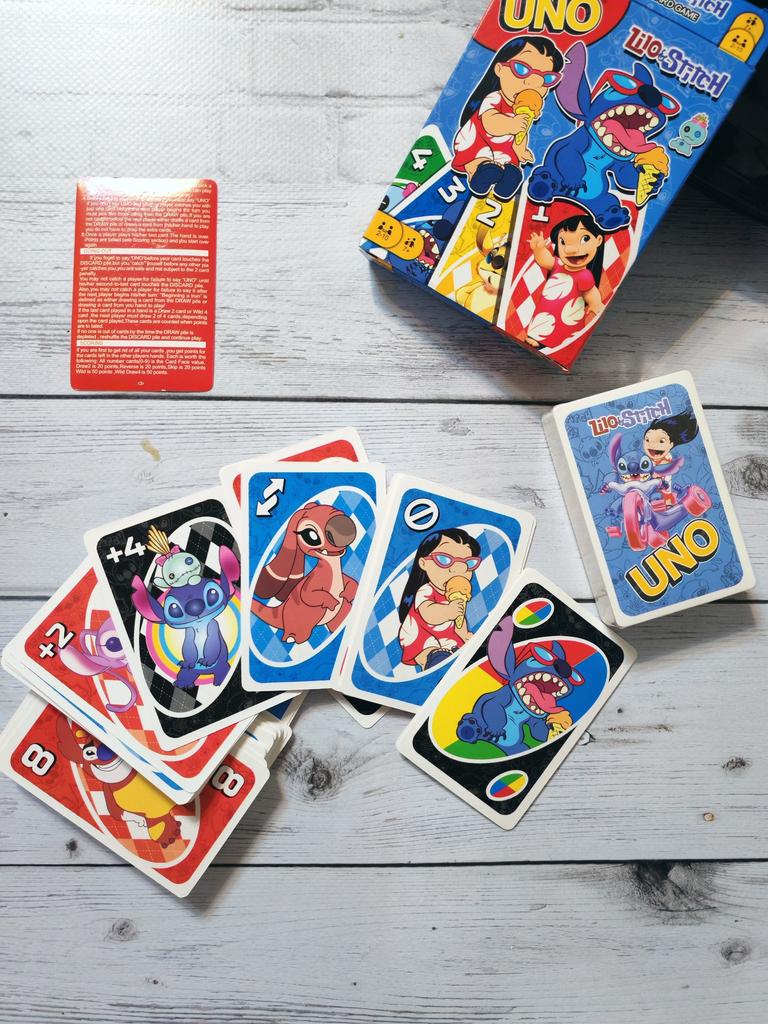 โค๏ธ๐The UNO card game "Stitch Family" with 108 cards is an excellent option for a fun time with the whole family. The cards are bright, printed with high quality, with clear images of the characters, which makes the game especially appealing to children and fans of the "Lilo & Stitch" cartoon. The game is easy to learn, the rules are understandable even for younger ages. It is suitable for 2โ4 players, holds attention, and adds an element of strategy and fun. The cards are pleasant to the touch, shuffle well, and do not bend during normal use..