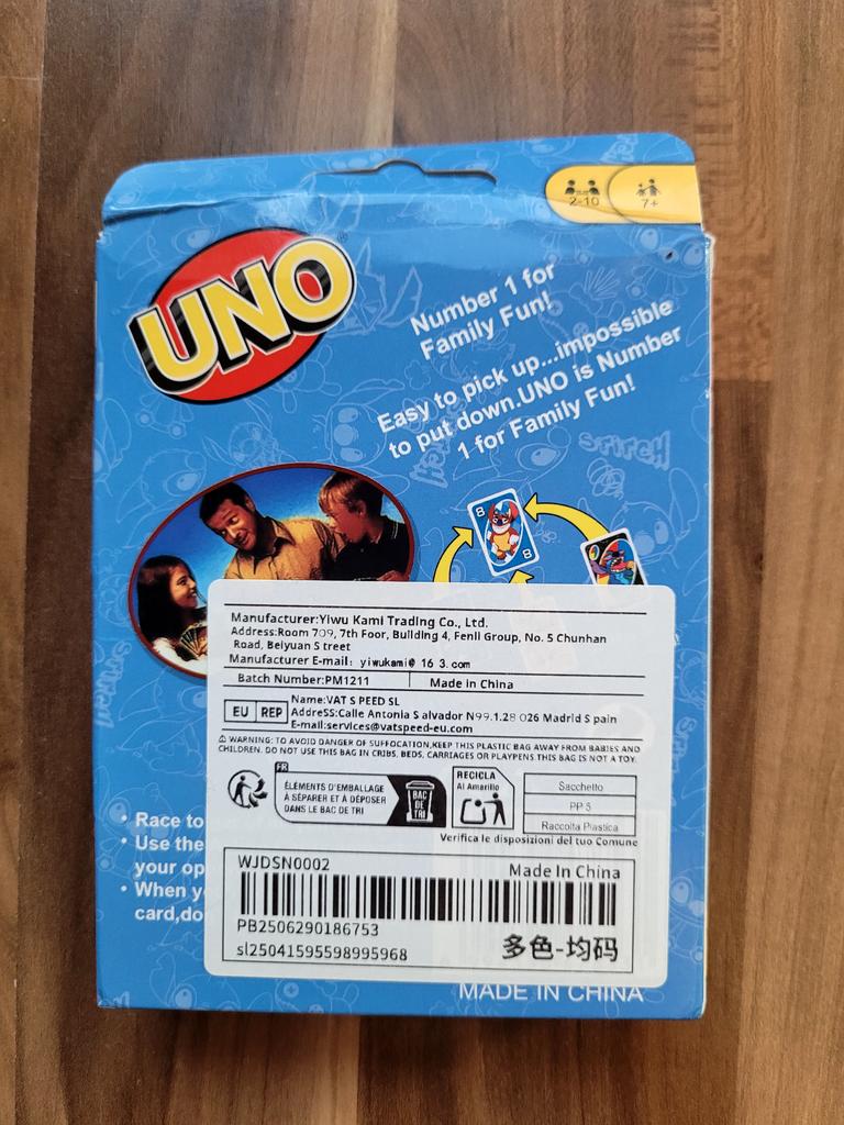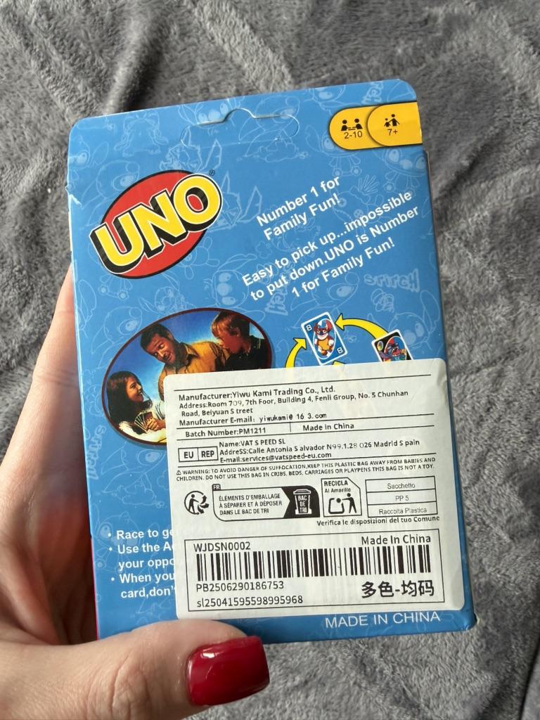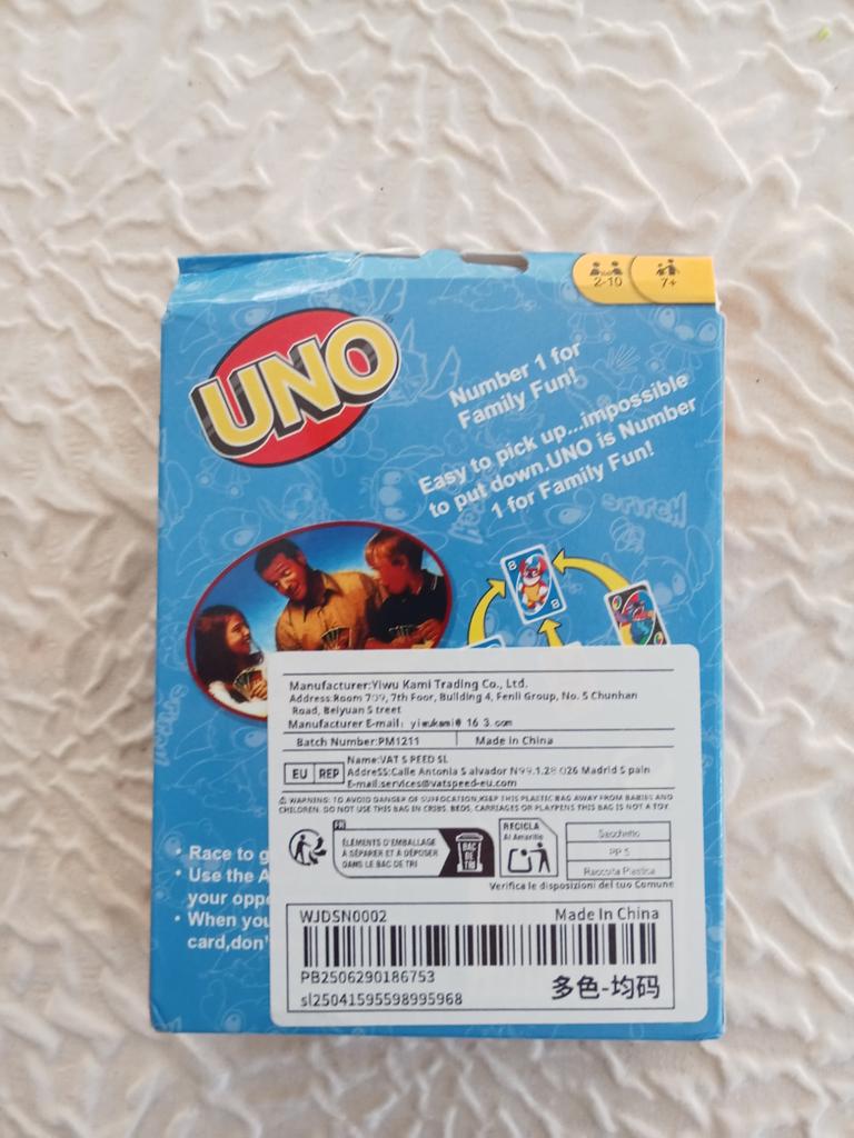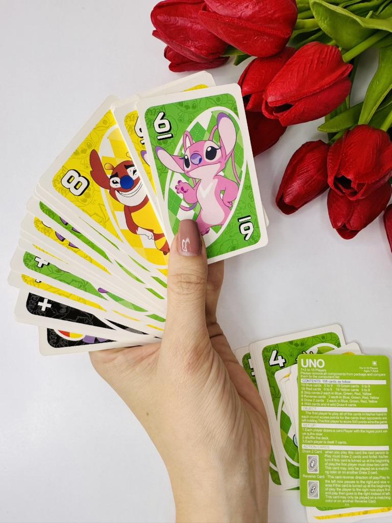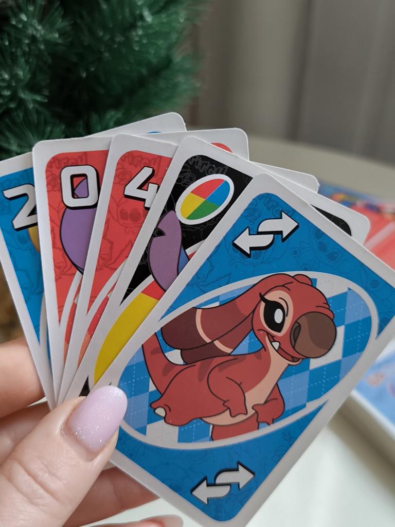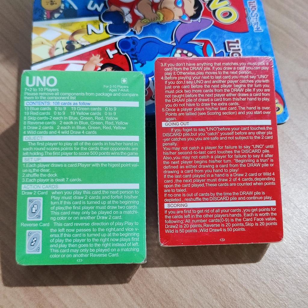 โค๏ธ๐The UNO card game "Stitch Family" with 108 cards is an excellent option for a fun time with the whole family. The cards are bright, printed with high quality, with clear images of the characters, which makes the game especially appealing to children and fans of the "Lilo & Stitch" cartoon. The game is easy to learn, the rules are understandable even for younger ages. It is suitable for 2โ4 players, holds attention, and adds an element of strategy and fun. The cards are pleasant to the touch, shuffle well, and do not bend during normal use..
