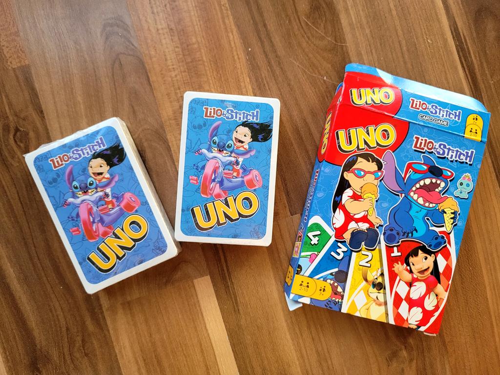 * sweet Lilo and Stitch UNO card game * โญโญโญโญโญ ๐ฅ๐๐ถ๐ฒ๐ณ๐ฒ๐ฟ๐๐ฒ๐ถ๐ Exactly 3 weeks until to Germany ๐ฅ๐๐ถ๐ฒ๐ณ๐ฒ๐ฟ๐๐บ๐ณ๐ฎ๐ป๐ด Included in the delivery is a deck of cards with two packs of 54 cards each. The card game is available in only one version. The whole thing was packaged in an ordinary plastic film . ๐ฅ๐ค๐๐ฎ๐น๐ถ๐รค๐ I am very enthusiastic about how cute the little figures are drawn on the cards ๐ I don't know if it's original from Disney or not, but in any case the colors and the depictions are original. However, I think it's a shame that the cards seem relatively thin. I fear that the cards will fray relatively quickly with frequent use.. Included is a game manual with the rules in English. From 7 years For 2-10 players CONTENTS: 108 cards 19 Blue Cards 19 Green Cards 19 red cards 19 yellow cards 8 Skip cards โ 2 each in Blue, Green, Red, Yellow 8 Reverse cards, 2 each in Blue, Green, Red, Yellow 8 Draws 2 cards, 2 each in Blue, Green, Red, Yellow 4 Jokers and 4 Jokers draw 4 cards My daughter was definitely thrilled about it. For material composition : Paper ๐ฅ๐๐ฎ๐๐ถ๐ Super nice UNO card game with Lilo and Stitch motif. Not only great for adults but also for children. The drawings are true to the original and the color too. My daughter was thrilled.. โDisadvantage: Unfortunately, the cards are quite thin, I don't know how long they will last ๐ซฃ โญโญโญโญโญ If you liked my review and it helped with a purchase decision, I would be happy if you followed me here, because many more useful reviews will follow in the near future. ๐