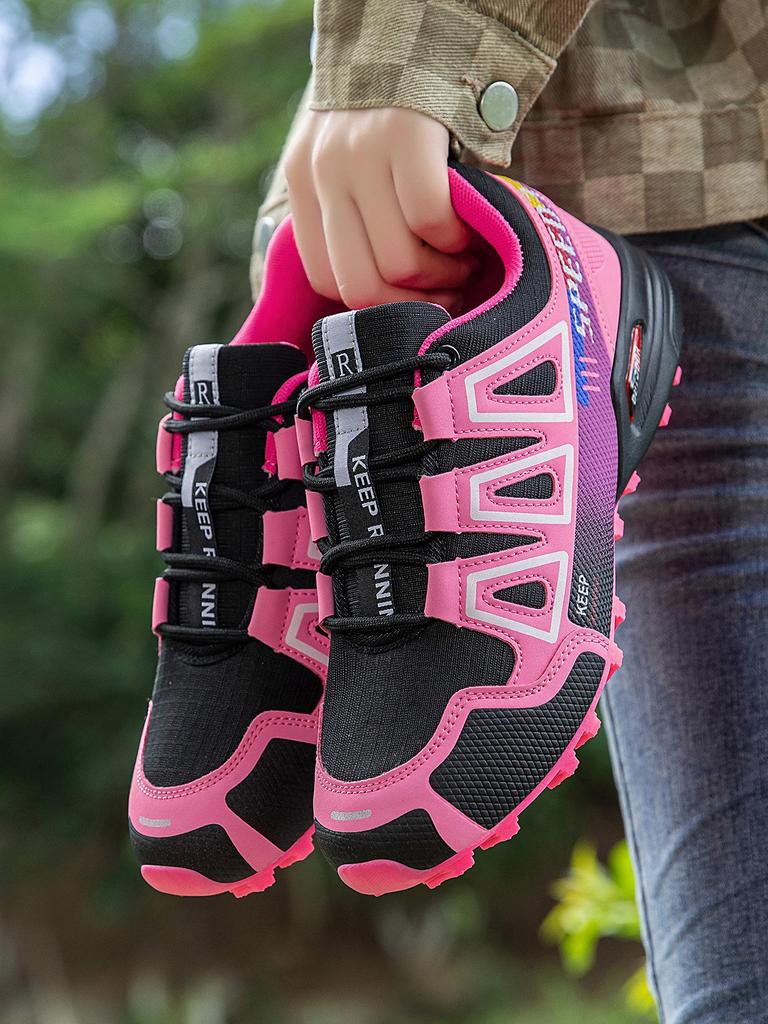 Introducing the perfect companion for your outdoor adventures, these shoes are designed specifically for women who love trail running, hiking, or walking. Crafted with a breathable mesh lining, they provide excellent ventilation to keep your feet comfortable and dry during strenuous activities. The EVA sole offers superior cushioning and support, ensuring stability and comfort on various terrains. Made with durable PU leather for the upper material, these shoes are both robust and stylish. Available in plus sizes, they are ideal for travel and casual outings, offering a blend of functionality and fashion for any active lifestyle.