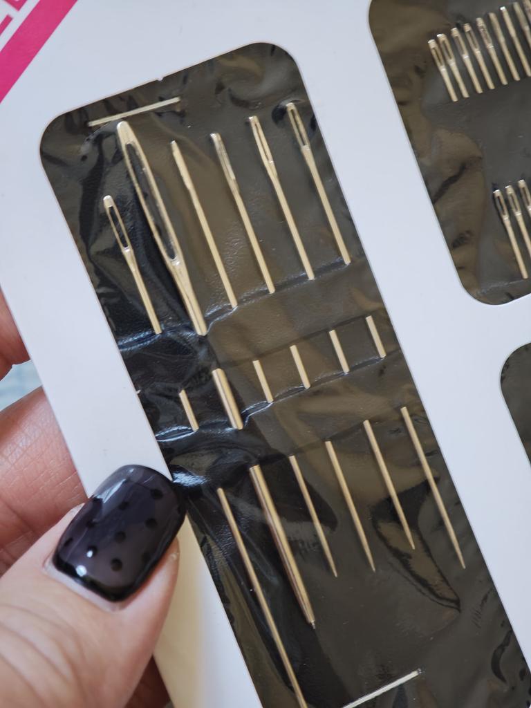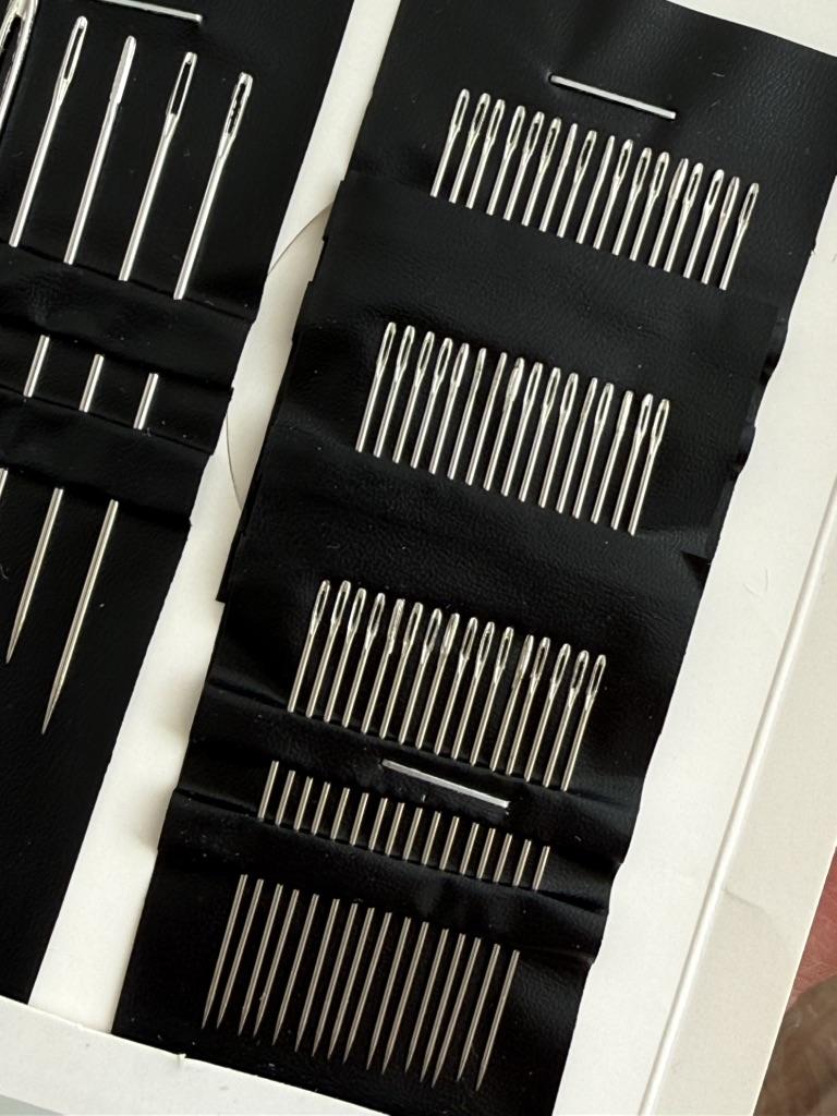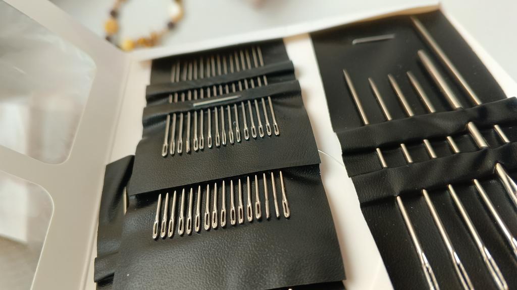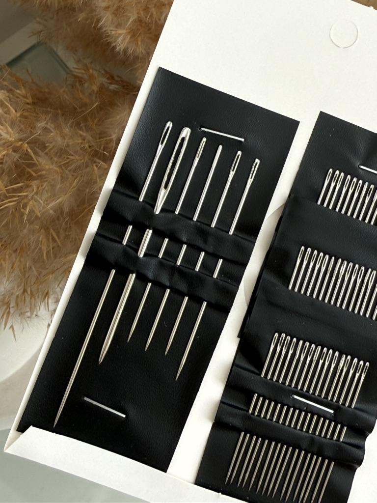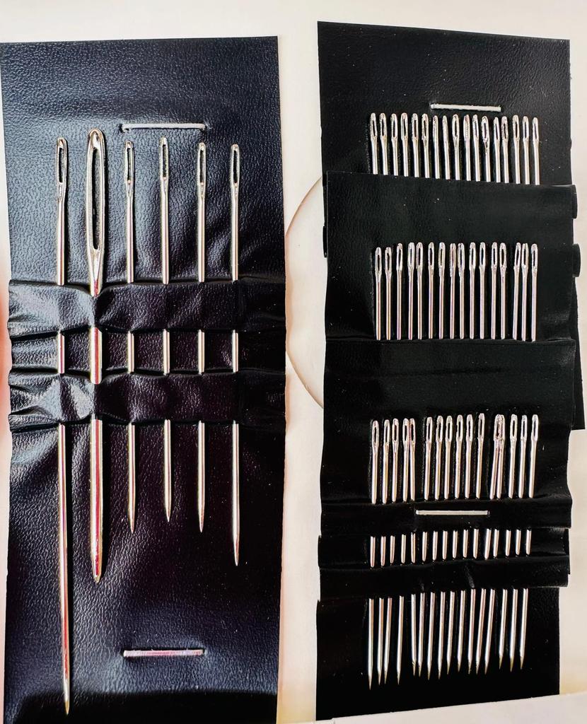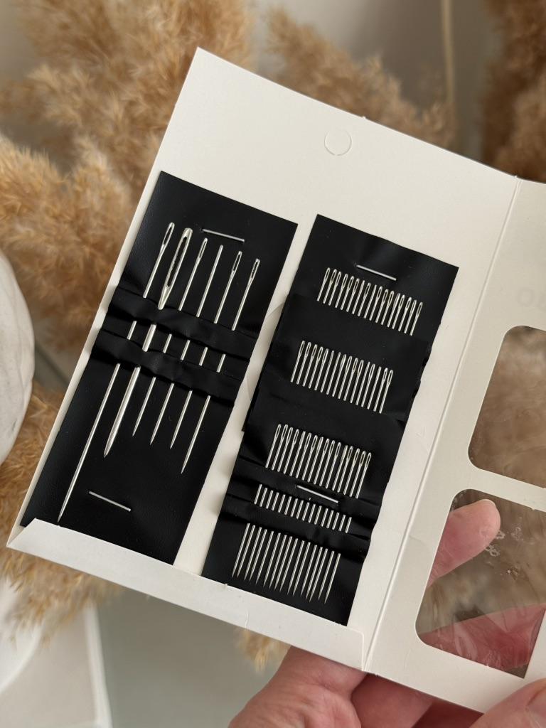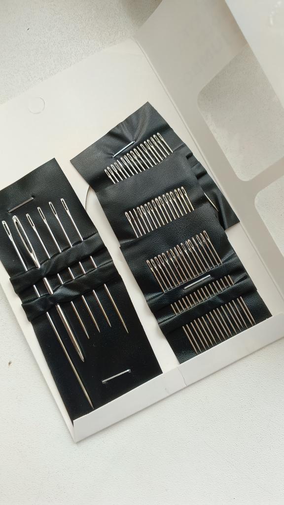 The package includes multiple needles with different lengths and eye thicknesses. This allows working with different types of threads and fabrics, from fine silks to thicker wools or embroidery threads.. Organization: The needles come arranged in a practical black holder that keeps them organized and protected, facilitating the selection of the appropriate tool for each task.