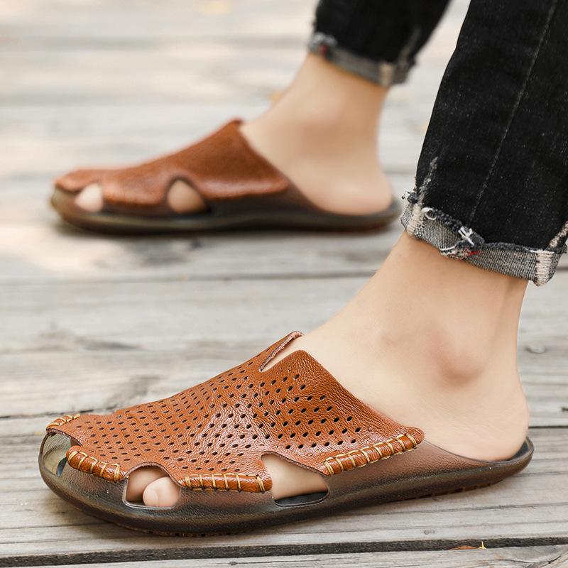 Large Size Handmade Bag Head Slippers Real Cowhide Men's Summer Outdoor Sandals Home Half Drag Korean Version Personalized Beach Shoes