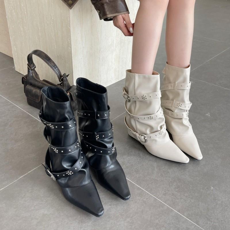 2025 New French White Short Boots Fashionable Pointed Head Wide Tube Thin Belt Buckle Rivet Wedge Heel Medium Tube Pants Tube Boots
