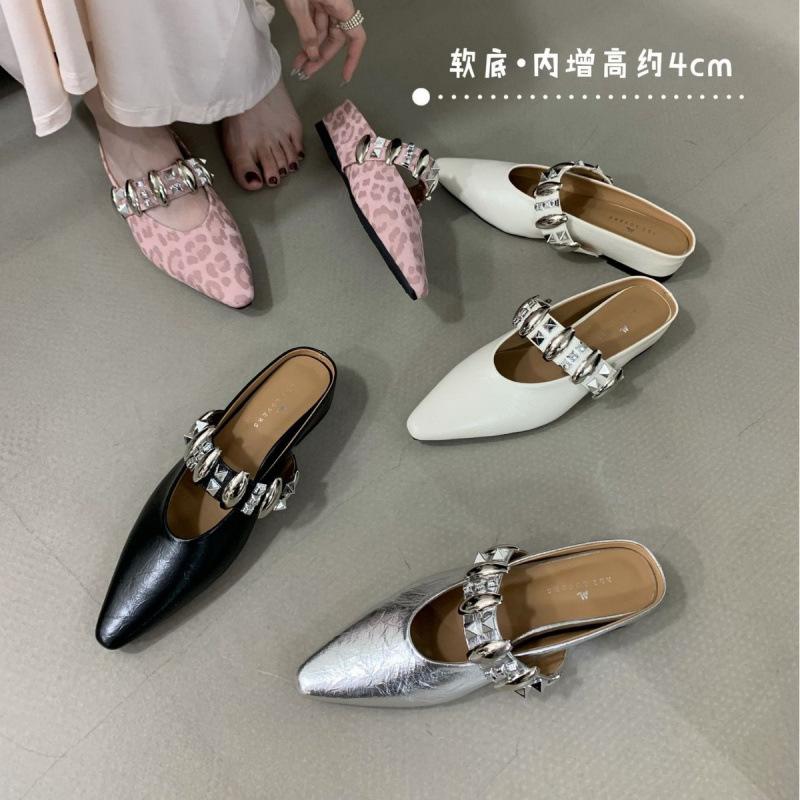 Inner Height Increase Rivet Bag Head Half Slippers Women's Summer Wear 2025 New Leopard Print Pointed Mary Jane Cool Slippers Silver
