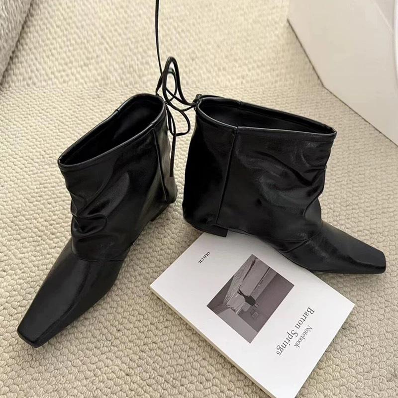 Cowhide Version~ Korean Niche Pleated Square Head Bow Fashion Pants Boots Short Boots Women's Thick Heel Wide Tube Women's Boots