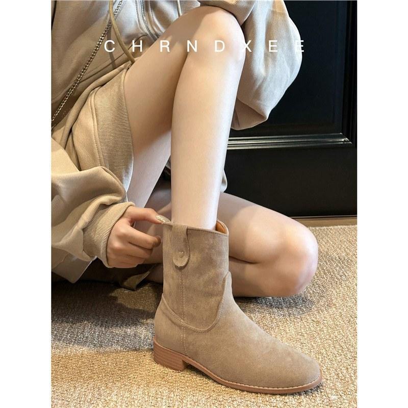 Cowhide Version~ 2025 New Retro Matte Round Head Sleeve Short Boots Women's Thick Heel Suede Versatile Martin Boots