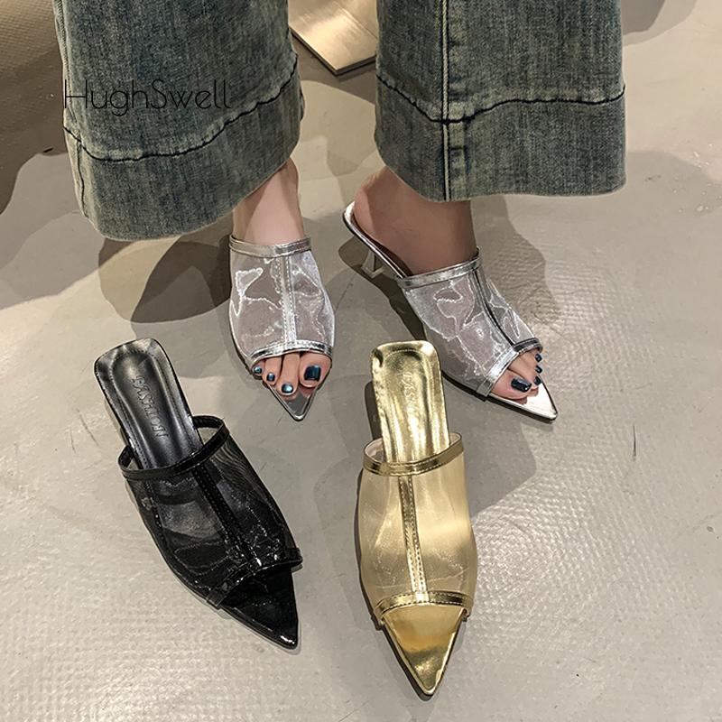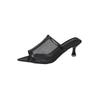 Fashion Transparent Silk Gauze Mule Slides Woman Bling Lace Mesh Pointed Toe High Heel Slipper Sandals Ladies Evening Party Pump Shoes