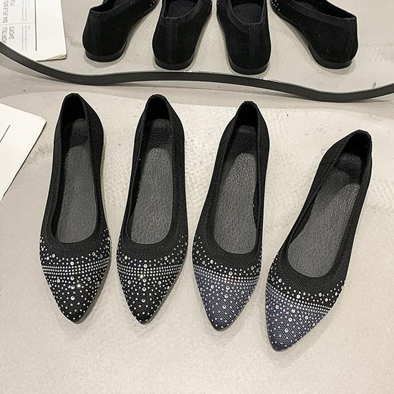Fashion Fashion Point Toe Rhinestone Ballet Flats Woman Breathable Knitted Shallow Loafers Ladies Concise Slip-on Walking Shoes
