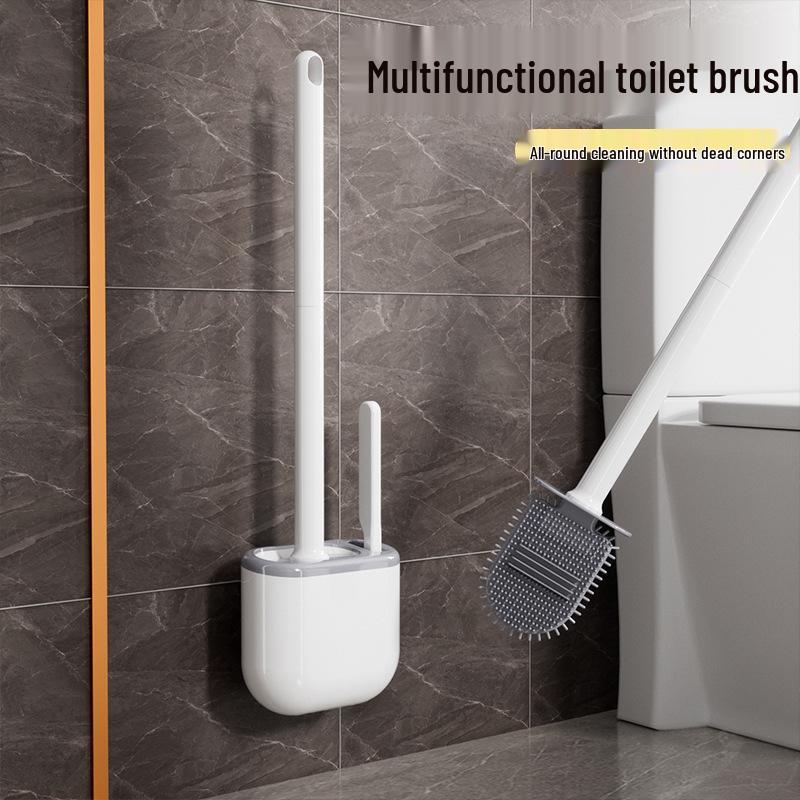 Wall-Mounted Silicone Toilet Brush Set with Long Handle and Base for Bathroom Cleaning