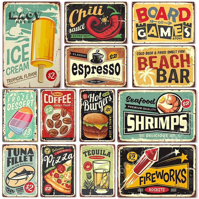 Coffee Ice Cream Metal Tin Signs Pizza Beverage Burger Fruit Poster Cafe Sign Plate Home Kitchen Dinning Wall Decoration Plaques