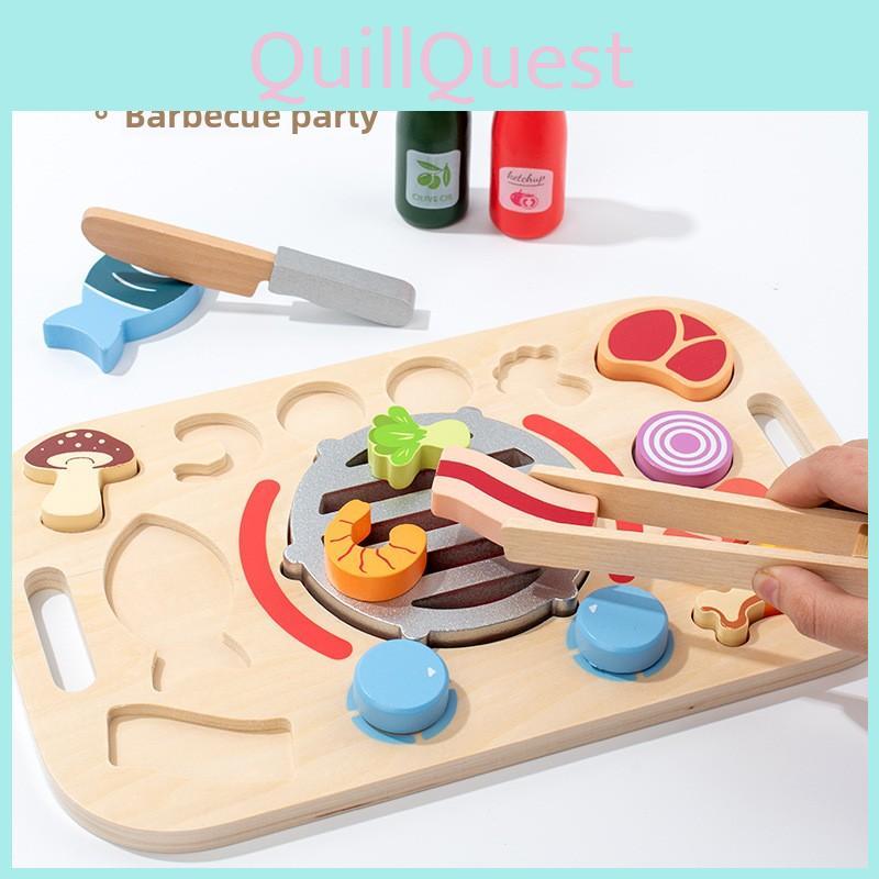 This wooden pretend play set features realistic barbecue, dessert, and fruitvegetable toys that promote imaginative kitchen role-play. Made of durable wood, it measures approximately 12 inches in length, 8 inches in height, and 4 inches in width. The set encourages hands-on interaction, supporting cognitive development and fine motor skills. Ideal for children during playtime at home or in educational environments, it fosters parent-child bonding and social skills. Wipe clean with a damp cloth to maintain its condition.