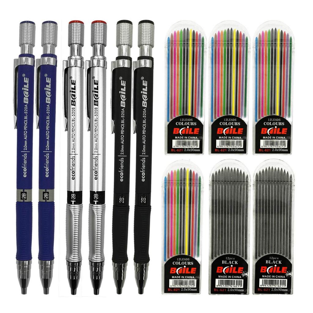 Six 2mm Mechanical Pencils with 4 Cases of Colored Lead Refills and 2 Cases of Black Refills for and Crafts Art, Sketching, Carpentry, Drafting,